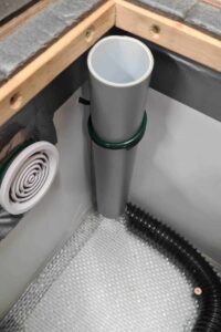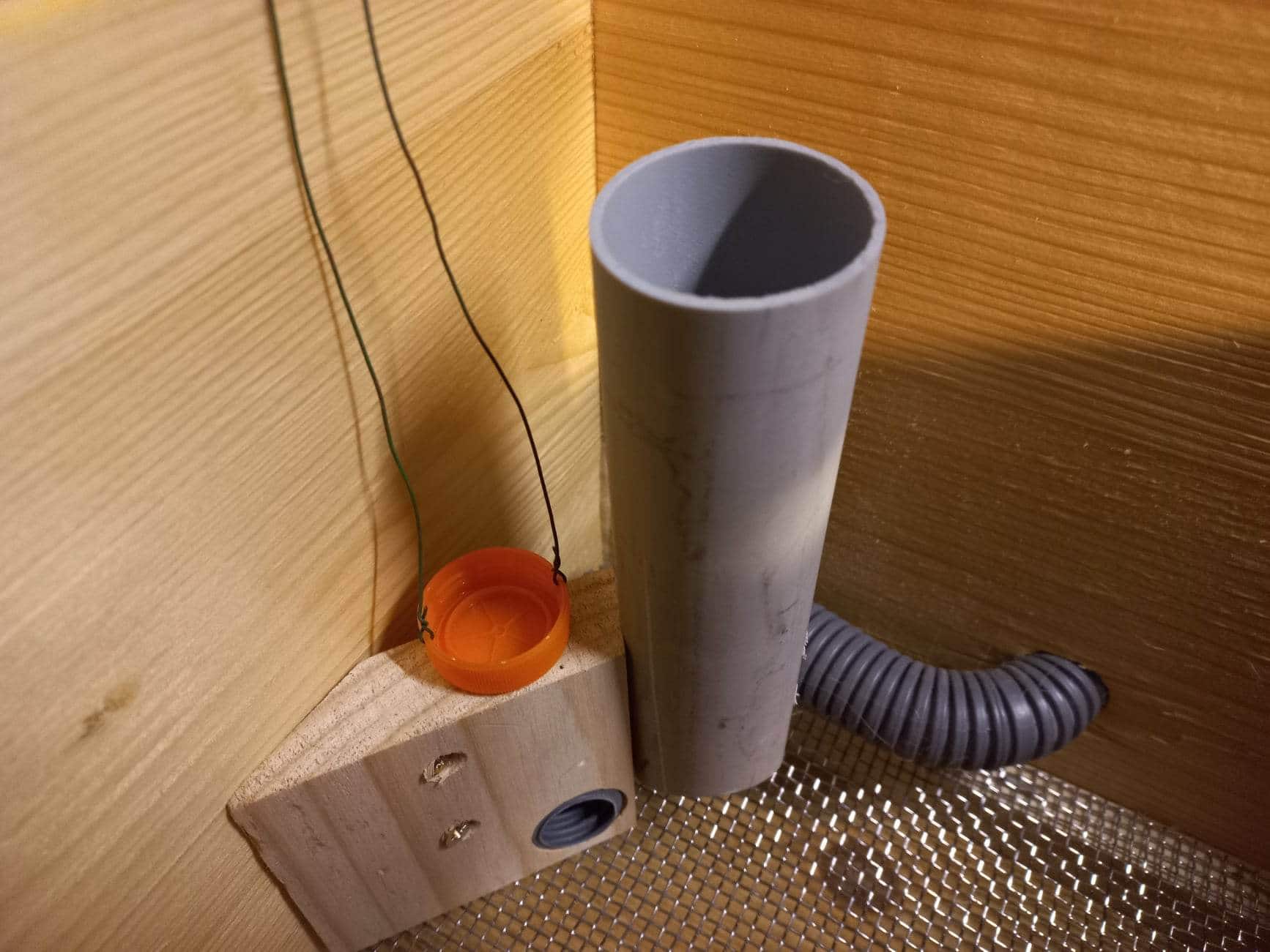 - Platzieren Sie neben dem Ausgang des Bienenstocks (oder dem Eingang des Korridors) ein senkrechtes Rohr mit einem Durchmesser von mindestens 30 mm (idealerweise ein 32-mm-HTEM-Rohr) an der Wand.
