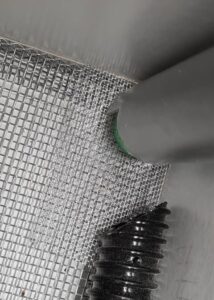 Schneiden Sie unten etwa die Hälfte bis zwei Drittel des Rohrs ab; dadurch entsteht eine Art Hohlraum. Die Höhe von 5–6 cm (vom Auge aus) ist ausreichend. - Das Rohr wird an Wand und Boden des Bienenstocks befestigt, vorzugsweise mit Heißkleber (es lässt sich nach der Saison leicht entfernen und reinigen). Der Draht kann L-förmig gebogen werden, um eine Art Stütze zu bilden, die die Stabilität am Auswurf erhöht.